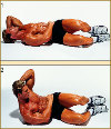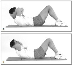 Многие люди жалуются на то, что после скручивания у них начинает болеть шея. Конечно, это вполне возможно, но только в том случае, если поднимать верхнюю часть туловища за счет мышц шеи, а не за счет напряжения мышц брюшного пресса. Другая ошибка заключается в том, что некоторые пытаются поднять туловище абсолютно прямо, вместо того чтобы немного его согнуть. Как же узнать, правильно ли вы выполняете скручивание живота? Поднимите лопатки, плечи и шею вверх и задержитесь в таком положении на пару секунд. Ваш торс должен быть слегка согнут, напоминая букву С. Подробнее см. фото А на рис. 1. И наконец, третья ошибка — во время скручивания живота некоторые забывают о правильном дыхании.