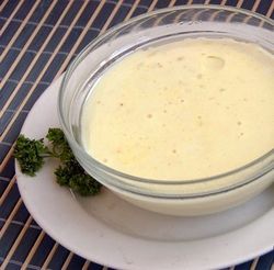 Сварить бульон, остудить и смешать с молоком, затем растворить в нем кукурузный крахмал. Варить на медленном огне, помешивая деревянной лопаточкой, пока соус не загустеет. Затем снять с огня, приправить солью и перцем. Добавить мускатный орех.