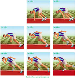 Стартовый разгон, как и старт, — основная составляющая успеха при беге на короткие дистанции. При разгоне спортсмен мощно отталкивается от дорожки, бедро поднимается под углом 90° к туловищу (рис. 6.5, а — з). Первый шаг выполняется в значительном наклоне, поэтому его длина небольшая (100-130 см).