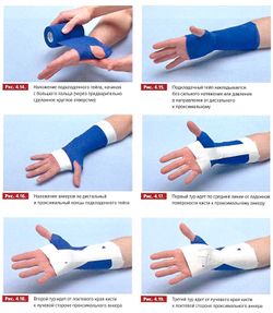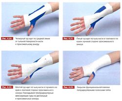 - Шестой тур идет по тылу кисти от лучевого ее края к локтевой стороне проксимального анкера. Накладывают (полу)циркулярные фиксирующие туры на дистальный и проксимальные анкеры