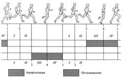 В двойном шаге содержится два периода опоры и два периода полета. В каждом периоде различаются две фазы. В периоде опоры: амортизация и отталкивание, в периоде полета: подъем общего центра массы тела (ОЦМТ) и снижение ОЦМТ (табл. 3.1, рис. 3.1).