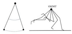 При анализе техники движения ног движения каждого звена нижних конечностей рассматривают отдельно. Траектории движения центров масс бедра, голени и стопы имеют сложную форму. Если движение центра массы (ЦМ) бедра можно рассматривать как движение простого маятника, то траектории движения ЦМ голени и ЦМ стопы представляют собой сложные эллипсовидные формы. Нога похожа на маятник, состоящий из трех последовательно соединенных частей (бедро, голень, стопа).