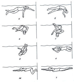 Затем следует постановка согнутых ног под утлом 90° в коленных суставах на стенку бассейна, верхняя рука входит в воду, выполняется толчок с поворотом на грудь и занимает обтекаемое положение (рис. 4.6, е, ж, з). При выполнении вращения туловище и ноги пловца должны находиться в одной плоскости. В случае, если ноги отстают от движения плеч, продолжительность вращения заметно увеличивается.