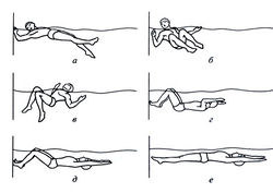 - 5-я фаза — первые плавательные движения под водой;