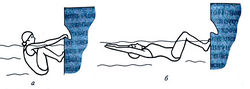 Упражнение № 5. Сесть на борт, поставив ноги на край пенного корытца. Поднять руки вверх ладонями вперед, голову опустить вперед. Не изменяя положения рук и головы, наклониться вперед, приближаясь грудью к бедрам (рис. 6.19, а). После этого, теряя равновесие, опуститься в воду руками вперед, разгибая ноги, оттолкнуться от борта. При входе в воду выпрямиться и в этом положении скользить в воде до всплытия на поверхность.