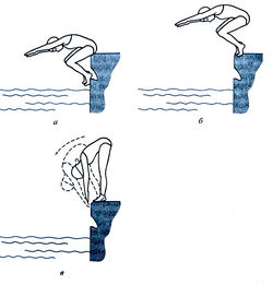 Упражнение № 2. ИП стоя на краю бортика бассейна лицом к воде (передняя стойка). Делают толчок вперед двумя ногами с одновременным смещением вперед туловища. Голова при этом не должна наклоняться лицом вниз, взгляд должен быть устремлен вперед. Затем соскоки выполняются с разным положением рук, в различных положениях (группировке, согнувшись).