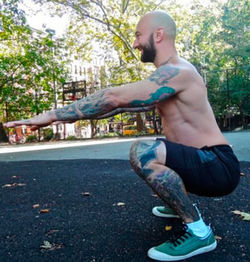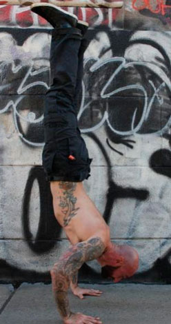 Сиг Кляйн выполняет свой фирменный жим «изгиб тигра». Это статическое положение, из которого можно выйти в стойку на руках. Это безумно мощное упражнение для локтевых связок и длинной головки — если оно для вас слишком трудное, можете попробовать простые отжимания или отжимания на коленях.