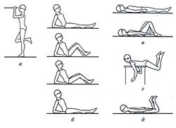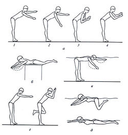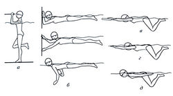 Согласование движений рук и ног. Вначале упражнение выполняется на суше в положении стоя на одной ноге (рис. 3, г), затем — в положении лежа на скамейке и только после этого — в воде. Если согласование получается неправильными (чаще всего начинающие делают гребок руками и одновременно подготовительное движение ногами), нужно дать упражнение в раздельном согласовании, т.е. выполнять гребок и подготовительное движение руками и после окончания движений рук — подготовительное и гребковое движения ногами (рис. 3, д).
