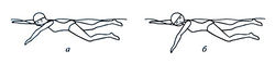 Упражнение № 19. Освоив гребок руками в согласовании с дыханием с подвижной опорой, приступают к изучению движений руками без опоры, вначале на задержанном вдохе, осуществляя зрительный контроль за гребками (рис. 6.6, а), а затем — движения руки в согласовании с дыханием (рис. 6.6, б). При изучении кроля упражнение движения рук в согласовании с дыханием является основным, и от того, насколько качественно оно изучено, во многом зависит успех овладения этим способом плавания.