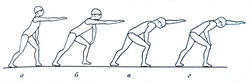 Упражнение № 10. В положении полунаклона одна рука опирается на согнутое колено одноименной ноги (рис. 6.4, а), другая вытянута вперед, выполняется имитация гребка и подготовительного движения. Гребок и подготовительное движение изучаются по частям: вначале имитируется вход руки в воду, затем — начало гребка и его окончание, потом — выход руки из воды и пронос ее над водой (рис. 6.4, б, в). Если занимающемуся не удается выполнить имитацию отдельных частей движения руки, сходных с теми, которые выполняются спортсменами, нужно предложить сделать движение в упрощенном виде. Для этого в том же исходном положении дается задание произвести движение спереди назад слегка согнутой в локтевом суставе рукой и, не разгибая локоть, вернуть ее через сторону в исходное положение. Такое же движение необходимо выполнять и другой рукой. Затем упражнение повторяется в согласовании с дыханием. Во время гребка рукой голова поворачивается и делается вдох. При возвращении руки в исходное положение голова поворачивается лицом вниз и выполняется выдох. Имитацию каждого последующего гребка можно начинать только тогда, когда занимающийся закончит выдох. Если время вдоха и выдоха превышает время цикла движения руки, то с каждым последующим циклом будет происходить опаздывание вдоха, и согласование нарушится.