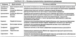 Основные представители цитаминов: церебрамин, гепатамин, вентрамин, бронхаламин, вазаламин, корамин, тимусамин, эпифамин, супренамин. Результаты действия отдельных цитаминов приведены в таблице 2.32.