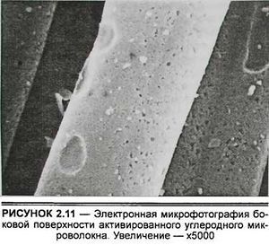 На рисунке 2.11 показана боковая поверхность элементарного микроволокна углеволокнистого энтеросорбента, а также хорошо видны многочисленные наружные поры, проникающие в не менее развитую систему внутренних пор микроволокна, по которым происходит транспорт и сорбция токсических веществ микроволокнистыми сорбентами.