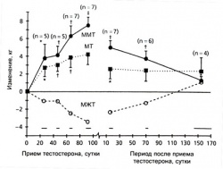 Типичный режим применения энаптата тестостерона в количестве примерно 200 мг в неделю на протяжении 12 недель приводил к увеличению массы тела в среднем на 4,1 кг(Forbes et al., 1992). На основании результатов определения содержания калия-40 оценка увеличения мышечной массы в конце 12-недельного периода приема стероидного препарата составила 7,5 кг. Эти данные подтверждались увеличением выделения креатинина в среднем на 358 мг-сут"1 (при диете, не содержащей мясных продуктов), что соответствует рассчитанному увеличению массы мышечной ткани на 8,6 кг.