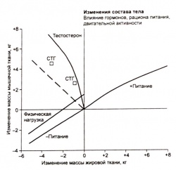 Использование андрогенных стероидов вызывает у здоровых мужчин увеличение массы тела и стимулирует включение аминокислот в мышечные белки. О точных механизмах наблюдаемого увеличения массы тела и о том, насколько ее можно увеличить при продолжительном приеме андрогенных стероидов и в течение какого времени она будет сохраняться после прекращения их применения, пока известно мало. В целом изменения массы мышечной и жировой тканей тела у человека примерно пропорциональны энергетическому балансу их организма, при этом около 2/3 изменений приходится на изменения массы жировой ткани тела. Форбс на основании данных изучения последствий чрезмерного и недостаточного рациона питания построил график этих закономерностей (Forbes, 1993). Он выдвинул предположение о том, что применение анаболических гормонов смещает организм человека с нормальной траектории в сторону существенного увеличения мышечного компонента и даже снижения доли жирового компонента. Иными словами, было сделано предположение о том, что использование добавочных андрогенных стероидов приводит к перераспределению утилизации питательных веществ в организме, подобно тому, как это наблюдается в случае группы препаратов β-адренергических агонистов,- которые были разработаны для применения в производстве продукции животноводства (например, кленбутерол) и способствуют специфическому увеличению массы мышечной ткани. Форбс был одним из первых, проиллюстрировавших этот принцип в исследовании с применением больших доз андрогенов у здоровых мужчин(Forbes et al., 1992). Однако все проведенные исследования, включая и последнее, оставляют без ответа один больной вопрос о роли пищевого рациона, влияния физической тренировки и надежности допущений, лежащих в основе каждого из методов, используемых для оценки этих изменений.
