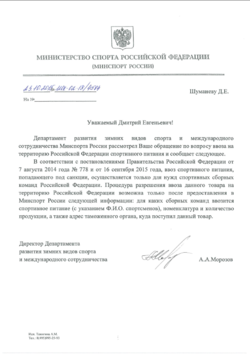 Спортивное питание из США и ряда других стран, в соответствии с постановлением правительства №778 от 07 августа 2014г, является санционной продукцией. Присутствует некоторая спорность в классификации, однако судебная практика встает на сторону таможни и признает уничтожение спортивного питания правомерным действием. В 2017 наблюдается всплеск задержек спортивного питания, юридическое основание находят в вышеуказанном постановлении. Зарубежное спортивное питание признают санкционным и задерживают, в некоторых случаях доходит до уничтожения [1]