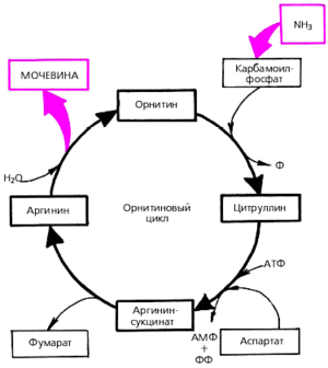 [[Image:040214786.GIF|300px|thumb|right|Схема биосинтеза мочевины в организме (орнитиновый цикл)]]