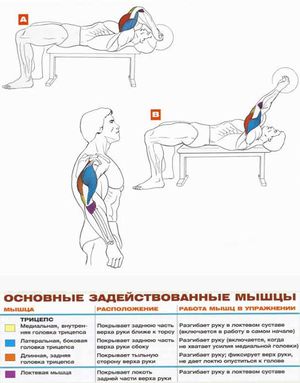 Задействованные мышцы: Если гриф штанги опускается ко лбу, то больше задействованы медиальная и латеральная головки трицепса, если гриф штанги опускается за голову, то задействована главным образом длинная головка трицепса.