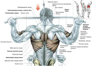 Не стоит гнаться за весом, лучше скиньте его вдвое, почувствуйте как работают правильно мышцы, для которых и существует данное упражнение. Продолжаем тянуть гриф до легкого касания с шеей (затылком). После того как произошло касание – делаем небольшую паузу внизу и только после этого разгибаем руки в локтях на вдохе. В верхней точке локти разгибаем, но не расслабляем плечевой пояс. Не нужно позволять мышцам спины и плечей слишком растягиваться, что может привести к растяжениям связок. В этой верхней точке, когда локти разогнуты, под конец изнуряющего сета с большими весами, можно позволить себе парочку вдохов и выдохов, перед решающим последним или предпоследним разом.