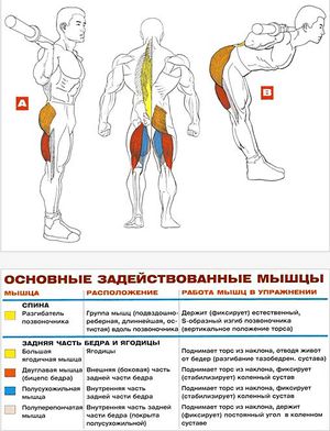 - Основная задействованная мышца спины в этом упражнении — разгибатель позвоночника. Ни в коем случае не расслабляйте ее до конца сета. У нее очень важная роль — фиксировать естественный, S-образный изгиб позвоночника во время наклонов.