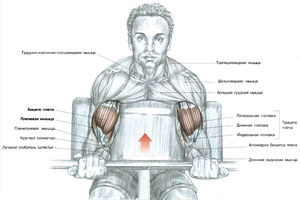 - Займите позицию на скамье Скотта и положите руки (трицепсы) на поверхность этой скамьи. Локти примерно на ширине плеч. Держите в руках либо штангу, либо пару гантелей.
