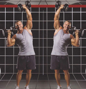 ВЫПОЛНЕНИЕ: Сначала выжмите кверху тяжелую гантель и держите ее на прямой руке. Затем поднимите перед собой вторую руку с легкой гантелью. Завершив сет, поменяйте гантели местами. Далее делайте тяжелые жимы другой рукой. В итоге вы должны сделать одной рукой 2 сета жимов и 2 сета подъемов перед собой.