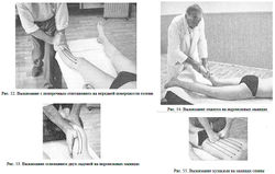 Движения в области поясницы. Массируемый лежит на животе, стопы — на валике, руки вдоль туловища. Массажист стоит перпендикулярно на уровне тазовой области. Одну ладонь он кладет на поясницу (поперек позвоночного столба) и мягко, без толчков надавливает на нее, а другой — с внутренней стороны бедра, чуть выше коленного сустава, поднимает ногу пациента вверх. Отведение ноги выполняется из этого же исходного положения, с той лишь разницей, что массажист кладет руку не на поясницу, а на тазовую область сбоку, выше головки тазобедренной кости.
