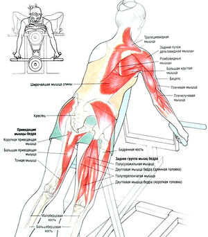 - Нога: задняя группа мышц бедра, ягодичные мышцы, приводящие мышцы бедра.