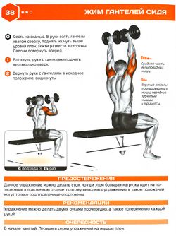 • Локти должны находиться строго под кистями по всей амплитуде движения. В этом случае, гантели будут двигаться по дугообразной траектории, немного сближаясь в верхней точке. Жим гантелей сидя выполняется двумя руками одновременно. Жим на выдохе (в самой тяжёлой точке), при опускании - вдох.