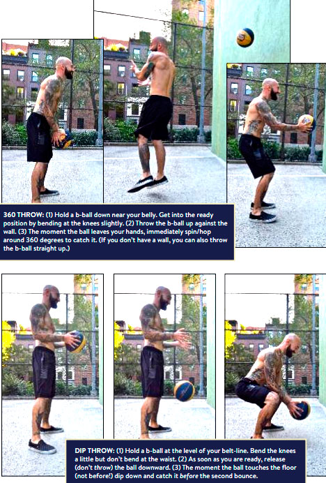 Бросок с разворотом на 360°: 1. Держите мяч возле живота. Займите исходное положение, слегка согнув ноги в коленях, а. Бросьте мяч в стену. 3. В момент, когда мяч покидает руки, резко обернитесь на 360° и подпрьггните, чтобы поймать его (если у вас нет стены, можете подбросить мяч вверх) Бросок с приседом: 1. Держите мяч на уровне пояса. Слегка согните колени, но не сгибайтесь в талии, а. Как только вы будете готовы, отпустите (не бросайте) мяч. 3. В момент, когда мяч коснется пола (не раньше!), нагнитесь вниз и поймайте его до второго отскока